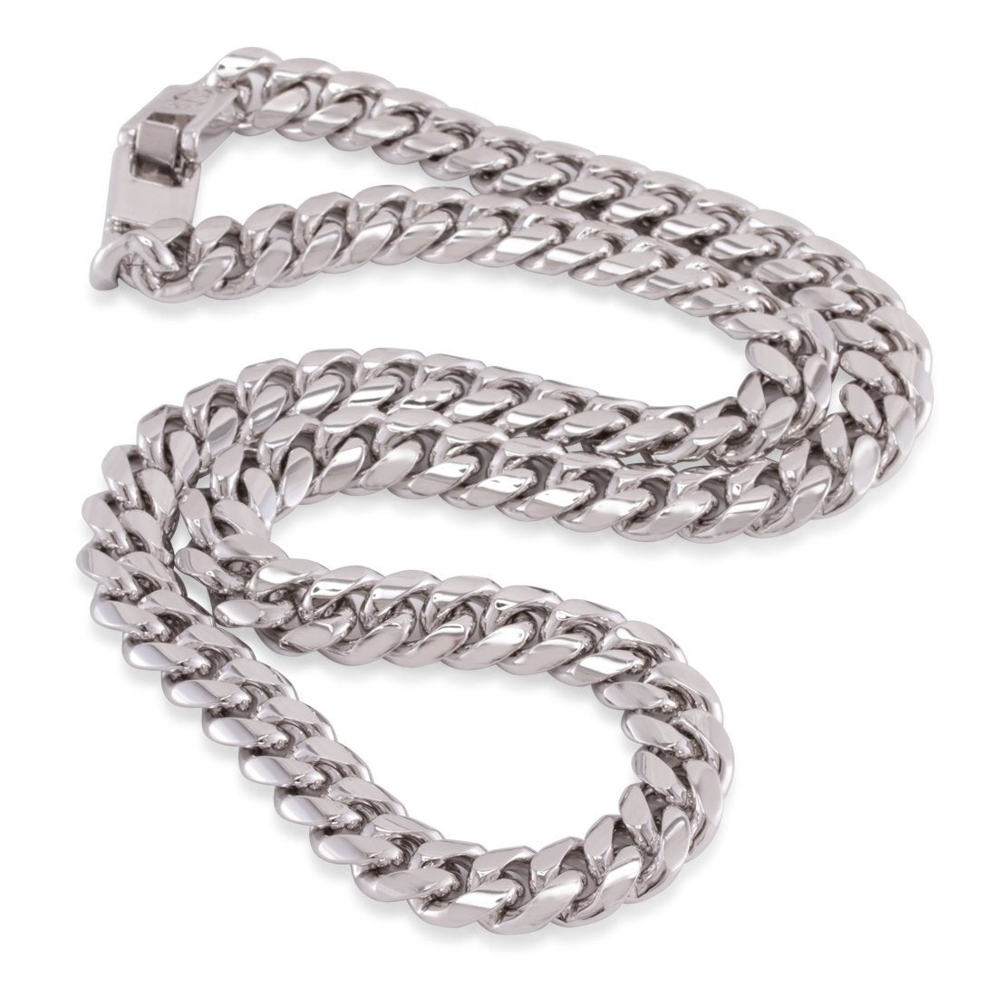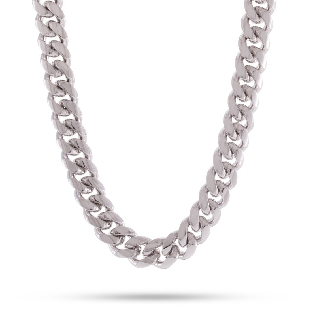 Made from solid stainless steel and finished with white gold plating, the Miami Cuban Curb chain has been a staple in the street wear industry. The 12mm thickness provides a sturdy, yet versatile look.